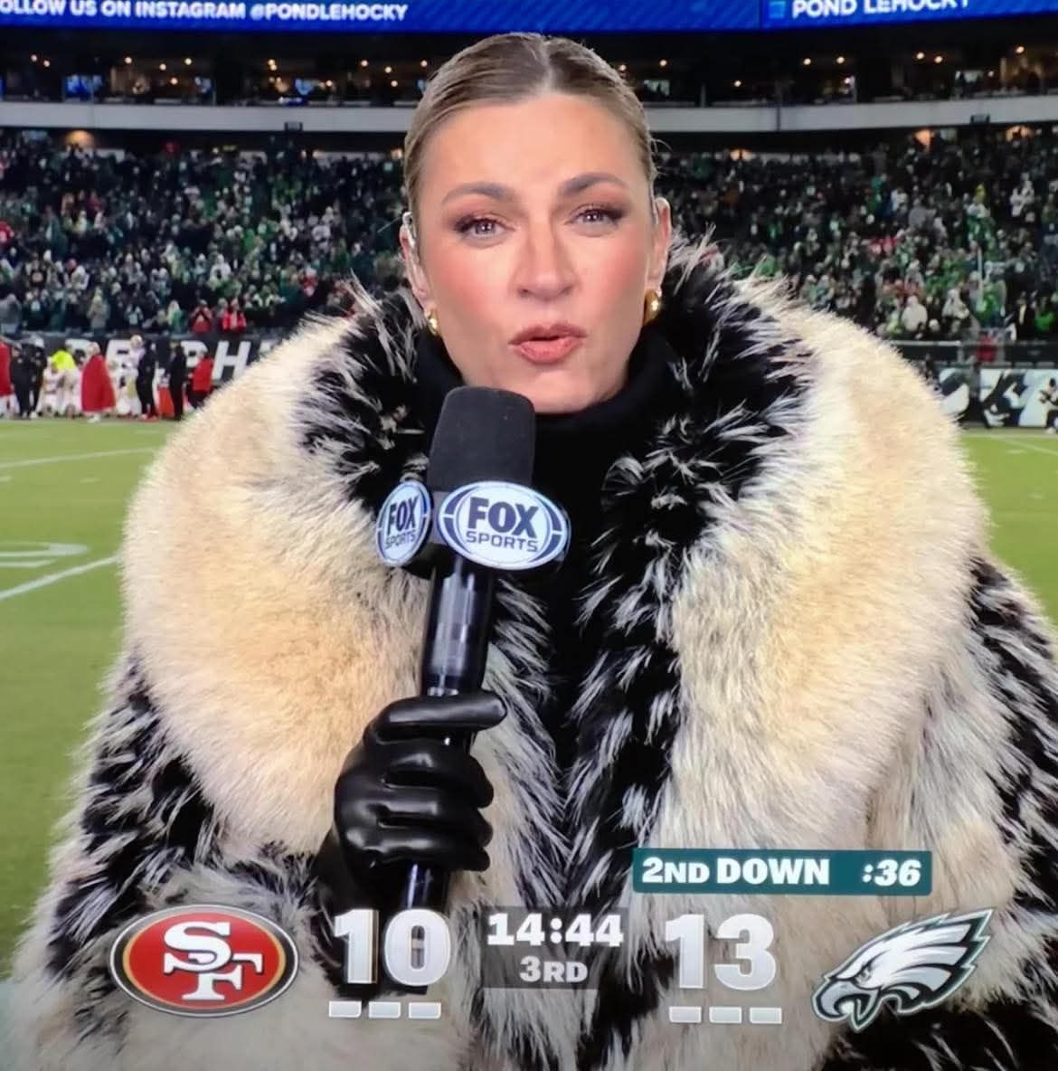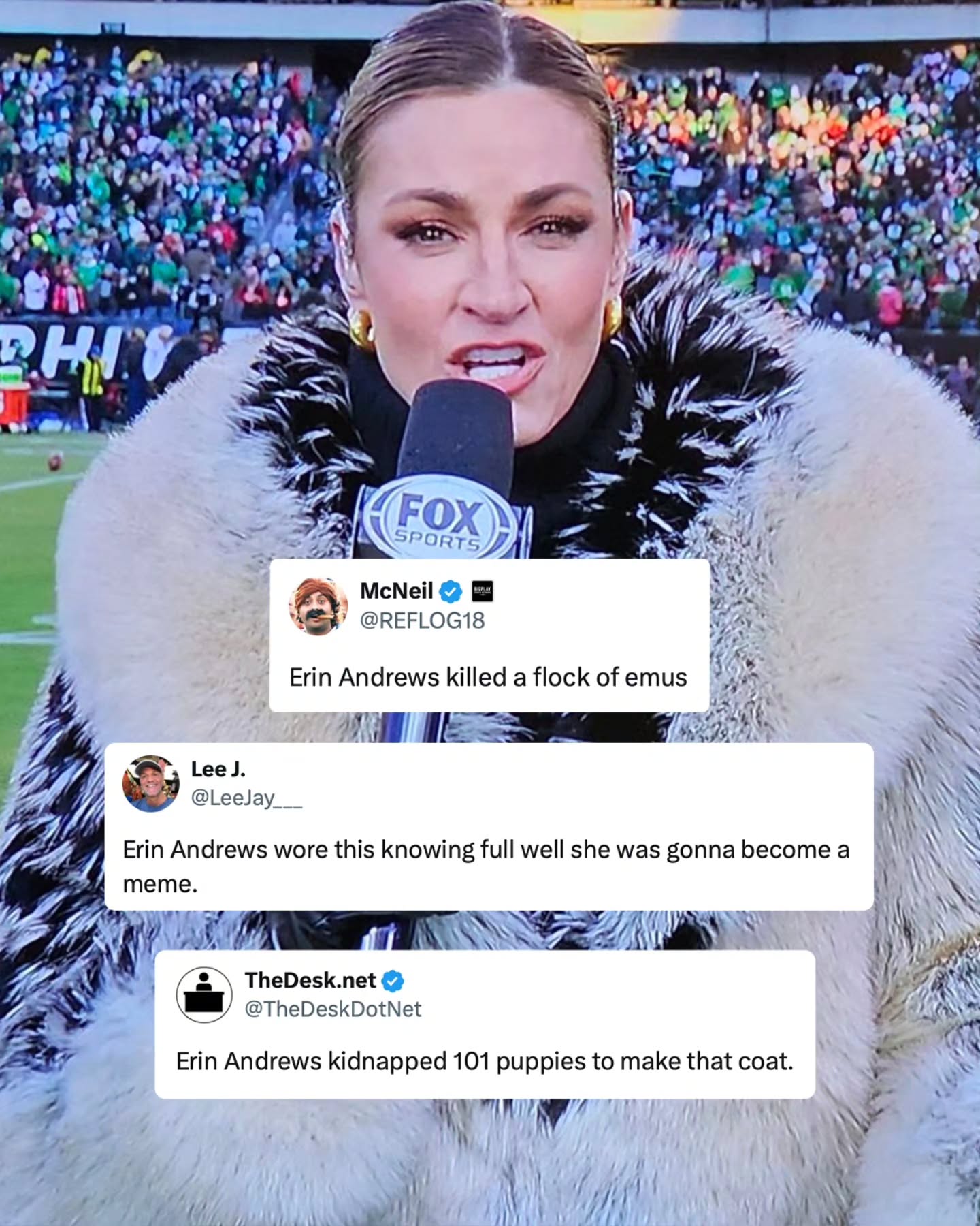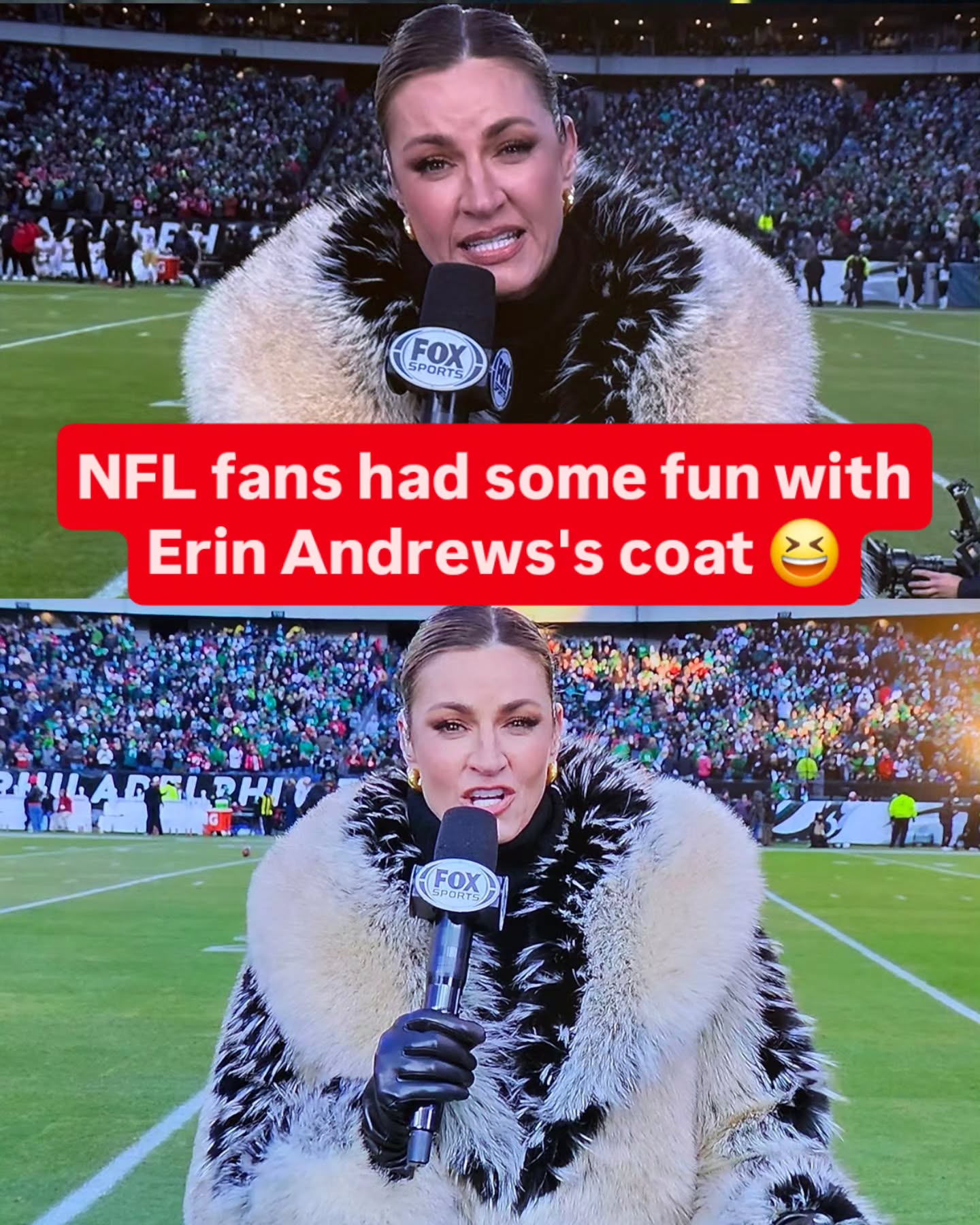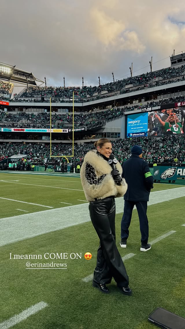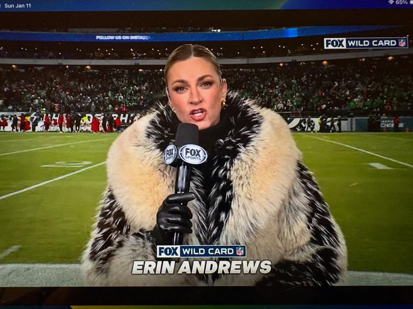 NFL fans went wild Sunday as Erin Andrews sexy flamboyant fur coat breaks social media and the Internet during the NFL Playoffs game between the Eagles and 49ers π The gorgeous Erin Andrews went totally viral on Instagram and X sparking memes comparing her to a “Flock of Emos” π The famous coat in question is The Fox Jacket from Auter, $950 and it currently looks sold out!